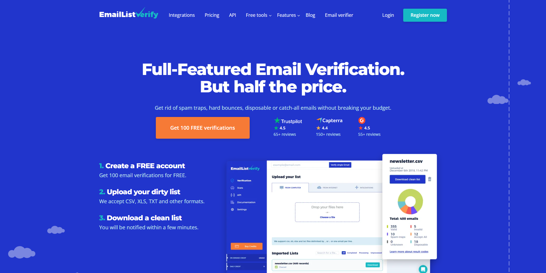 Emailistverify is made for scale and offers some of the highest-speed verification on the market, clocking 100,000 email verifications/hour/user. The platform is fine-tuned for a high-volume approach, making it competitive on pricing. Despite that speed and volume, it does a thorough job of verifying leads. It even checks for major deliverability issues, including bounce & syntax checks, spam traps, and disposable email addresses. EmailListVerify uses a robust REST API for bulk verification and automated list cleaning.