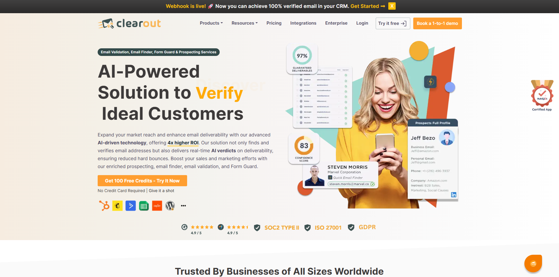 Clearout uses AI-powered tools to ensure clean lists for sales teams and other pros. It features a standard email verifier tool and Form Guard, an AI tool that automatically prevents mistakes at the point of data entry to keep databases accurate. The platform also features Google Sheets integration, and it can verify lead emails, phone numbers, and even names when appropriate.